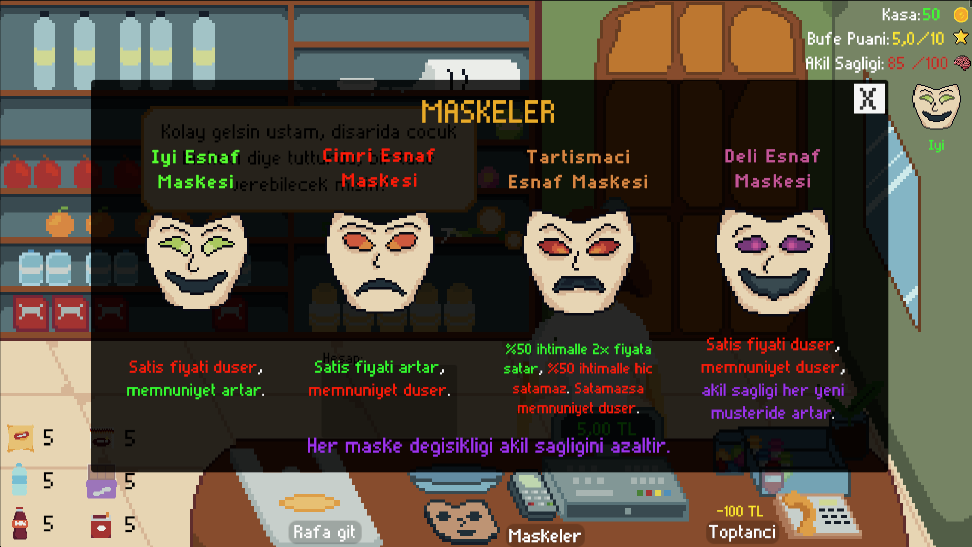 Maskeler sosyal hayatta taktığımız davranış tutumlarıdır. Sen bir bakkalsın, müşterilerinle nasıl geçineceğin sana bağlı.. Paranı, akıl sağlığını ve büfe puanını koru. Herhangi biri eksiye düşerse oyun biter.